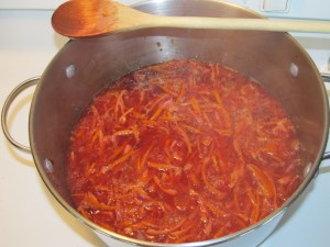 3. Bring to a boil over medium-high heat, making sure to stir occasionally. Reduce heat and gently boil, stirring occasionally until the peel becomes soft – about 30 minutes.