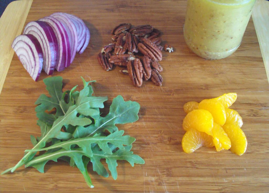 3. Combine arugula greens, red onion, mandarin oranges and pecans in a large serving bowl.
