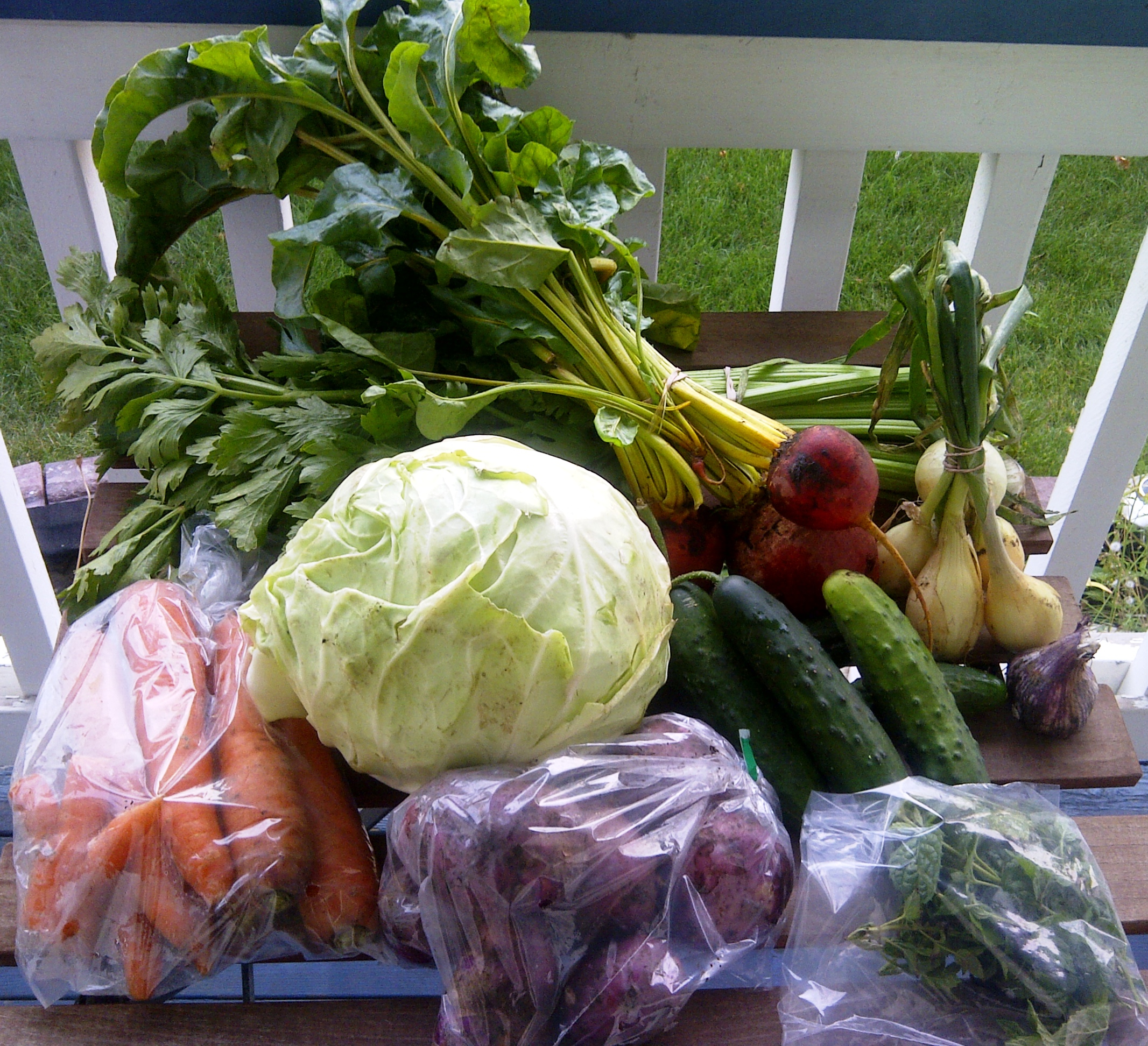 This week, we received a bunch of orange beets (apparently these are sweeter than the red variety) complete with greens, celery with tops still attached, carrots, cabbage, potatoes, cucumbers, mint, onions and some fresh garlic.